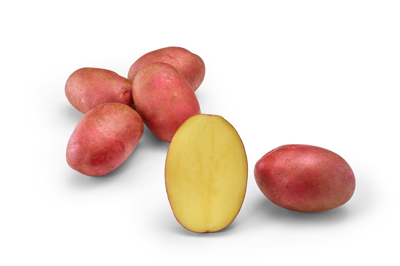 The Reza potato is a medium-early, red-skinned variety with deep yellow flesh that has high culinary quality and yields. It is known for its excellent cooking qualities, particularly for frying, and its high resistance to diseases like potato cyst nematode (PCN) and wart disease, making it suitable for both conventional and organic farming. This versatile potato is good for fresh consumption and processing, including French fries. This is a Solana product.